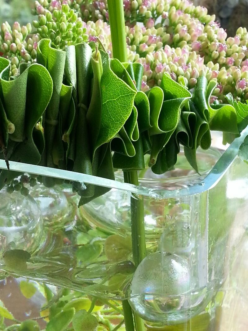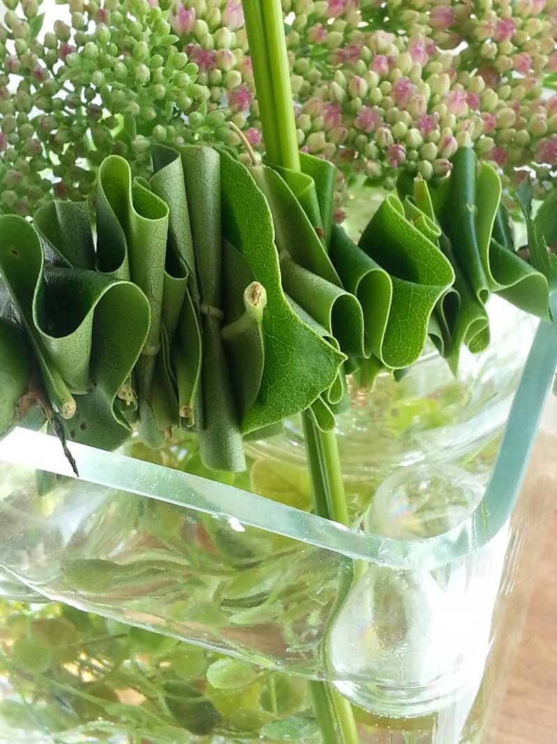 Um eine einzelne Blüte dekorativ zu präsentieren, spießt man Blätter ziehharmonikaartig auf einen dünnen Holzstab auf und legt diesen quer über ein Glasgefäß.