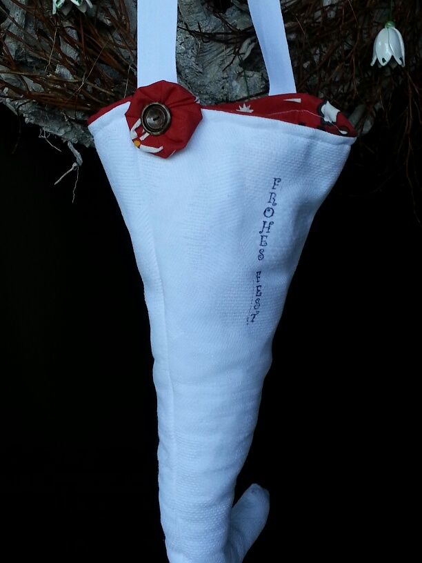 Manchmal nähe ich daraus „Elfentaschen“, also eine Art Hänge-Utensilo. Gefüllt mit kleinen Seifenstücken, verzieren sie beispielsweise die Gäste-Toilette oder versehen mit alten Postkarten oder Briefen, hängen sie dekorativ an einem Schrank oder an einer Wand. Zu Weihnachten verzieren sie den Kamin oder die Eingangstür.