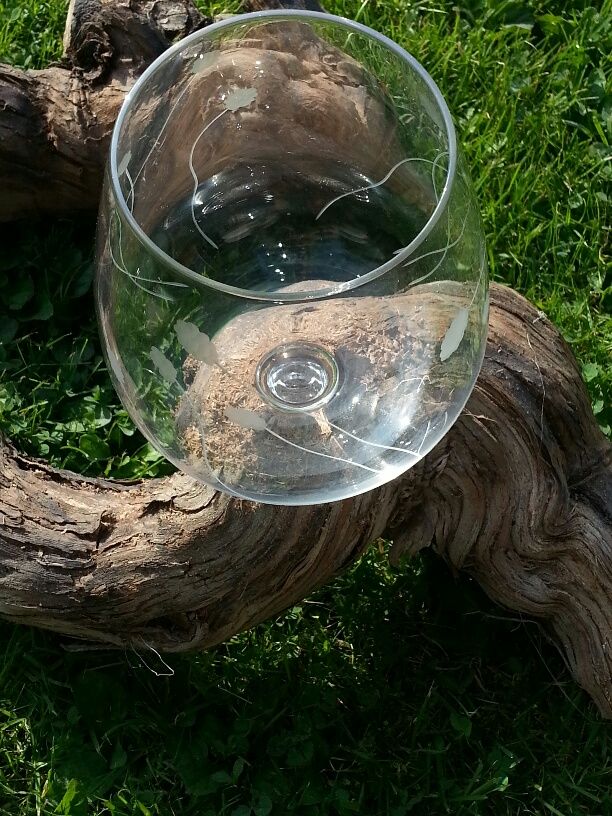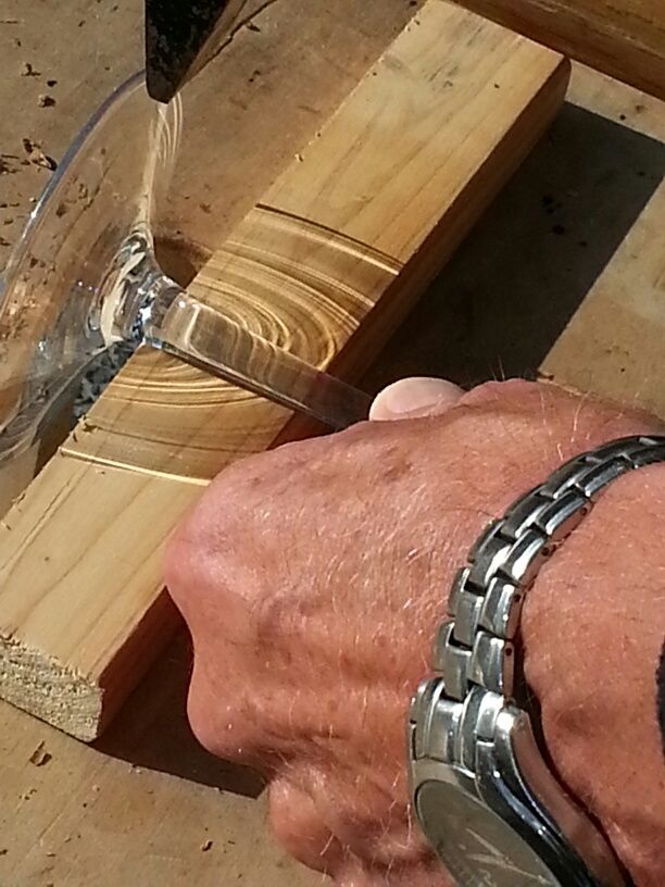Man schlägt den Stiel eines Weinglases vorsichtig ab und steckt dann dieses in ein Stück Holz, in das zuvor ein Loch gebohrt wurde.
