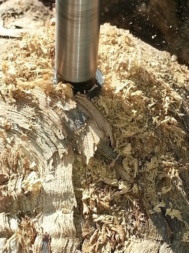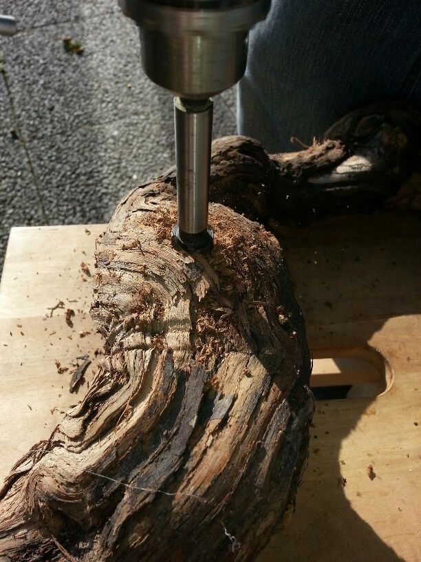 Mit einer Bohrmaschine bohrt man dann ein Loch in das Holz. Ich habe eine Weinreben-Wurzel genommen, aber ebenso gut kann man ein Stück Kaminholz oder ein Stück Stamm nehmen. Sollte das Glas ein wenig wackelig sitzen, befestigt man es mit ein wenig Knetgummi oder einem Blatt Küchenpapier.