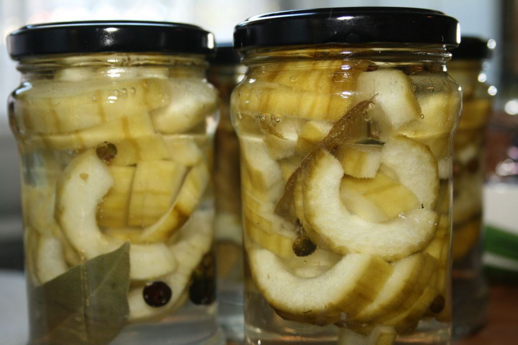 In Twist-off-Gläser füllen, einige Pfefferkörner hinzu, mit dem Sud aufgießen und verschließen.