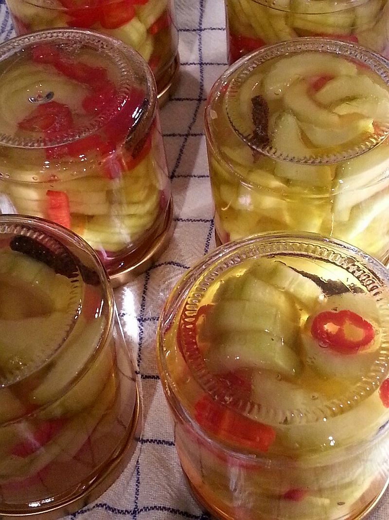 Ich mag gern Dill, deswegen gebe ich in jedes Glas noch etwas frischen Dill dazu. Außerdem stelle ich den Sud auf Vorrat her (kochend in Twist-off-Gläser füllen und verschließen) und koche damit hin und wieder „Gurkensalat“ ein. Dafür schäle ich Schlangengurken, halbiere sie, entferne mit einem Löffel die Kerne und schneide sie in Scheiben. In dem heißen Sud die (halben) Scheiben einmal kurz aufwallen lassen, sofort in kleine Gläser füllen, den kochenden Sud darübergeben und die Gläser verschließen.