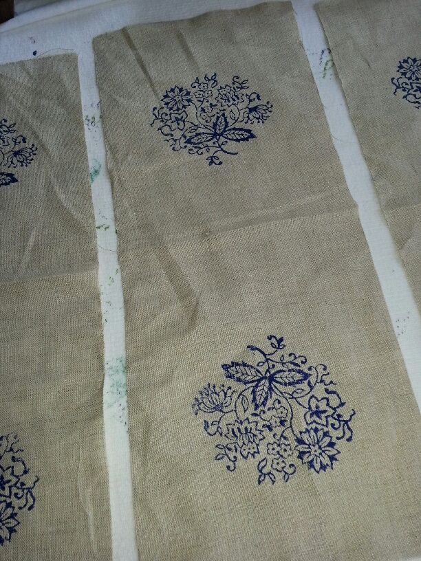 Dann setzt man ihn schön gerade und mit wenig Druck auf den Stoff und nimmt ihn ebenso „gerade“ wieder ab, damit das Muster nicht verwischt. Die Farbe muss nun gut durchtrocknen und anschließend bügelt man einmal drüber. Sie soll nun waschfest bis 60 Grad sein. Gute Holzstempel sind teuer, deswegen habe ich zu Haus mit vorhandenen Stempel experimentiert.