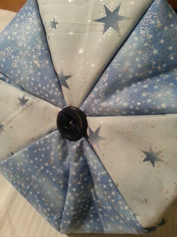 Per Hand näht man nun jeweils die Spitzen des Ober- und des Futterstoffs zusammen. Ich setze immer einen Knopf oder eine Stoffblüte darauf, weil es mir nie so schön gelingt.