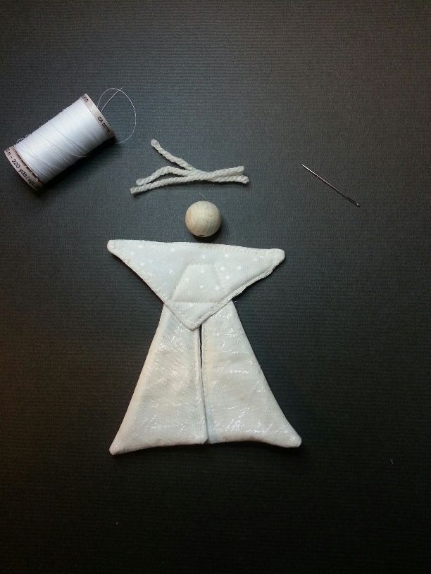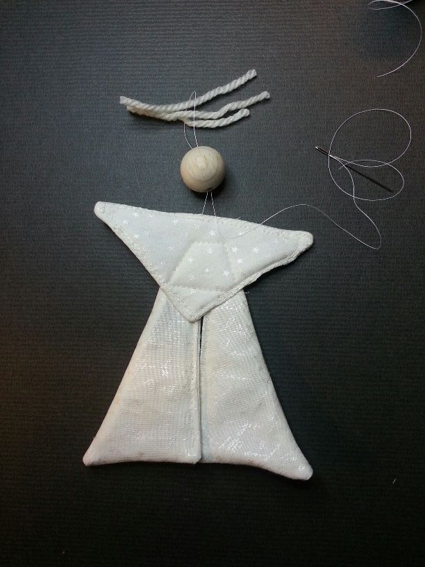 Mit einem Bindfaden (ich habe Quilting-Garn genommen) näht man nun den Kopf (die Holzperle mit Bohrloch) und die Haare an den Engel-Körper.