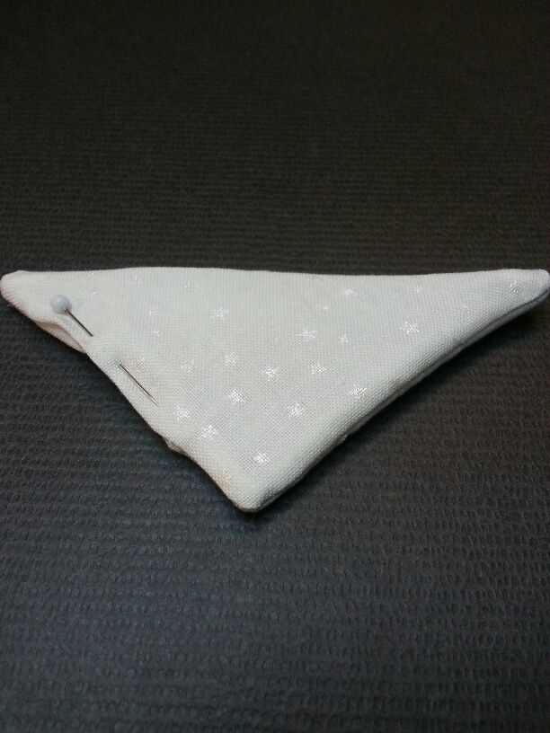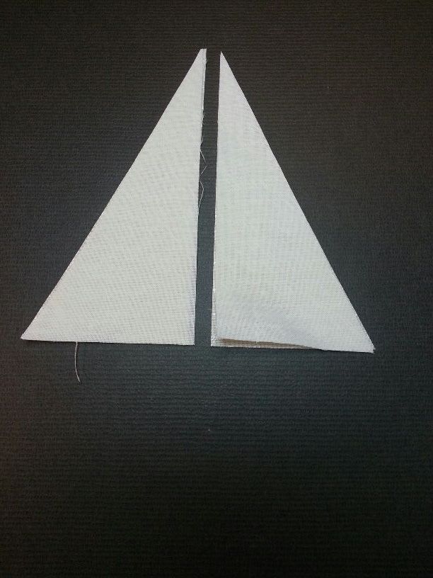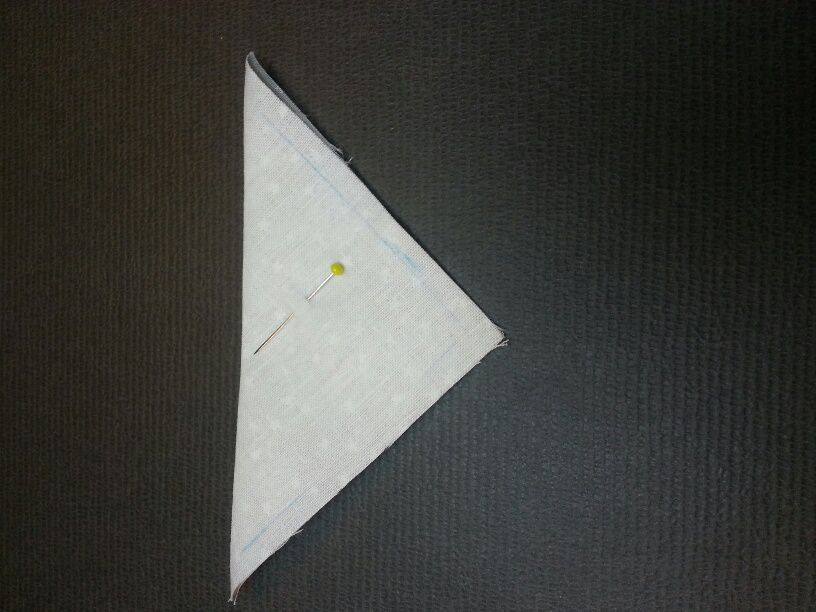Stoffteile jeweils rechts auf rechts zusammennähen, eine Wendeöffnung auf der geraden Seite lassen. Spitze abschneiden.