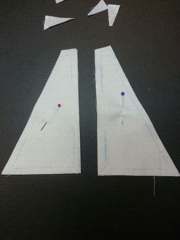 Wie auf dem Foto zu sehen, wird jetzt der Flügel auf die beiden Teile aufgesetzt, festgesteckt und vernäht.