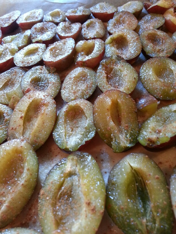 Ich habe etwa ein Kilo Pflaumen benötigt und da diese sich als noch etwas unreif herausstellten, gut mit Zucker und Zimt bestreut