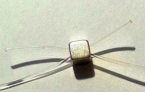 Es folgen pro Gummiband 5 Halbedelsteinsplitter, bevor die Gummibänder gegengleich durch eine Perle mit einer größeren Öffnung (in diesem Fall ein Silberwürfel) gezogen werden.