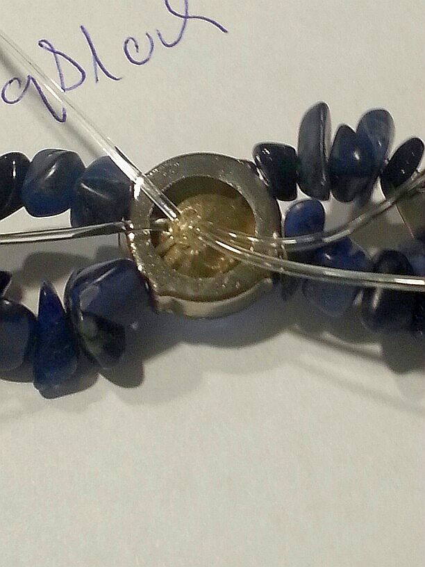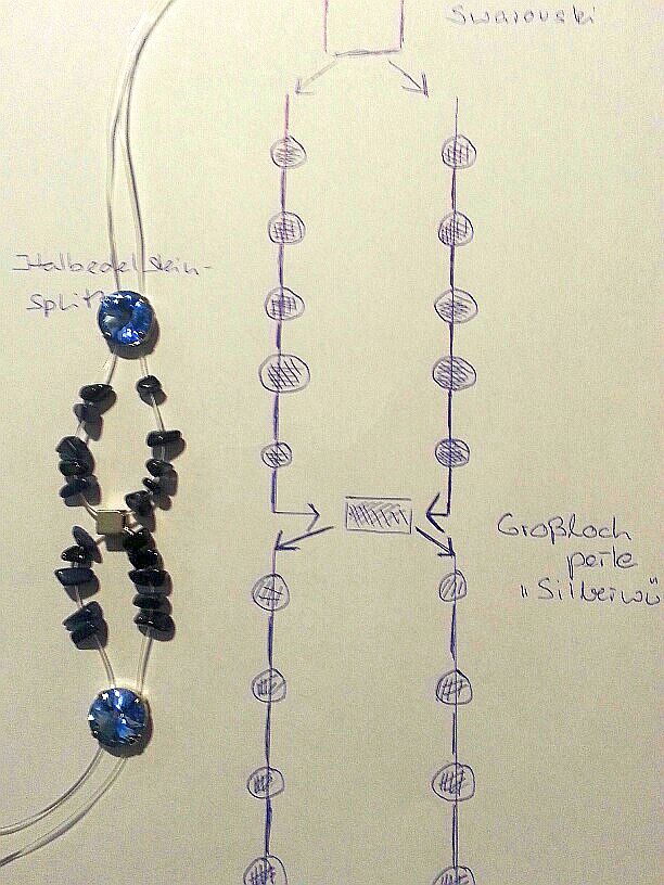 Da ich ausreichend Halbedelstein-Splitter habe, ist es nicht weiter tragisch, ich suche mir eben die mit der passenden Bohrung aus. Ist der Perlenschatz nicht so umfangreich, sollte man ein etwas feineres Gummiband kaufen, damit es auch wirklich durch jedes Bohrloch geht.