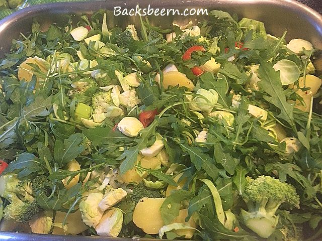 Dieses Mal sind es vorgekochte Kartoffeln, Rosenkohl, Brokkoli, Ruccola, Paprika, Staudensellerie und Kohlrabi.