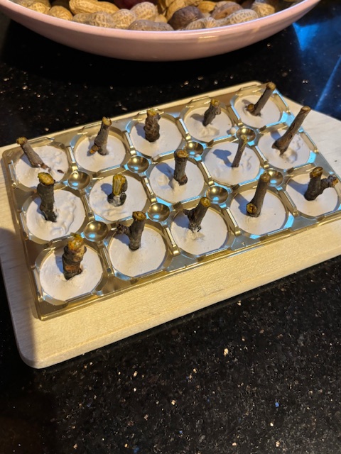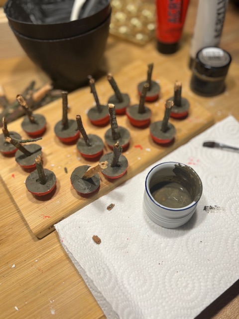 Nach einigen Minuten vorsichtig kleine Zweigstücke in die leicht gehärtete Masse stecken und etwa 2 Stunden aushärten lassen.