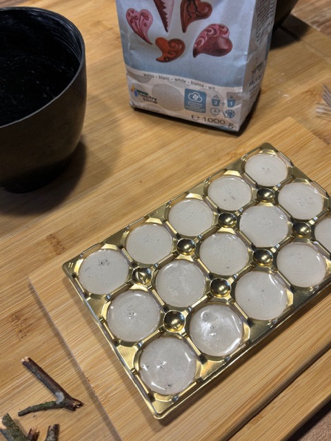 Man benötigt eine leere Packung Toffifee, Gießmasse, kleine Zweige und etwas rote und weiße Farbe.