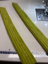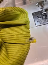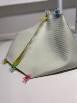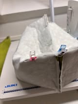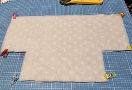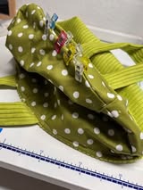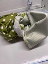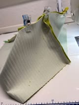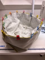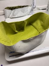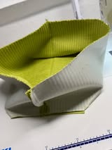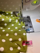 Auf den Innenstoff H630 bügeln, anschließend beide Teile rechts auf rechts aufeinanderlegen und wie beim Außenstoff die rechte und linke Seite absteppen. Die untere Kante ebenfalls absteppen, nur dort eine kleine Wendeöffnung lassen.