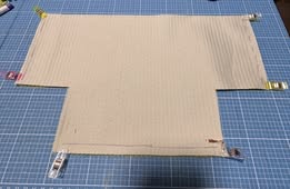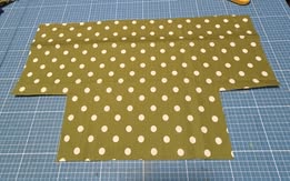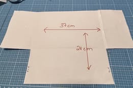 Schnittmuster: 37 cm (Breite) x 21 cm (Höhe). An den beiden unteren Ecken jeweils ein 8 cm x 8 cm großes Stück heraussschneiden …. siehe Foto
