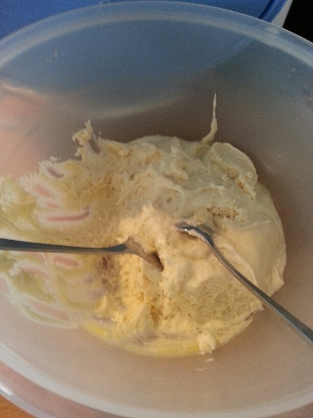 170 g Mehl, 1 Päckchen Puddingpulver Vanille ( ich nehme etwa 40 g Stärke und eine frische Vanillestange)und 1 Päckchen Backpulver dazugeben. Ich gebe Mehl immer durchgesiebt dazu, dann wird der Teig etwas feiner (kann aber auch Einbildung sein).
