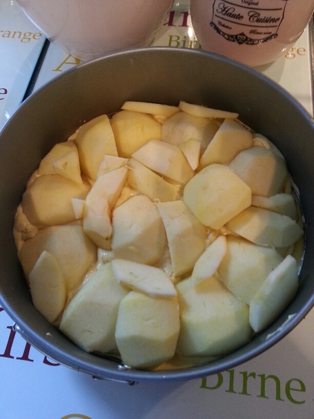Den Teig in eine passende Form füllen und mit den Äpfeln belegen.