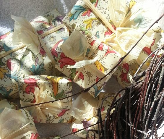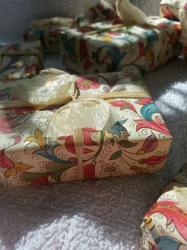 Kleine Seifenstücke kann man wunderbar in schönem Papier einwickeln und -versehen mit einer Schleife- dekorativ im Bad oder in der Gästetoilette aufbewahren.