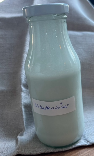 Eine Bekannte hat mir jetzt ein „Rezept“ für einen Etikettenlöser gegeben, der sehr schnell selbstgemacht werden kann.